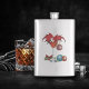 Um dragão vermelho giro num copo de martini segurando uma azeitona verde. Ornamentos, azeitonas verdes e um presente à sua volta.