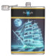 Um navio pirata fantasmagnificamente desliza pelas ondas, brilhando sob a lua luminosa. As velas são onduladas com um brilho etéreo, gotas de água jorrando como estrelas. O céu noturno tranquilo revela a beleza do oceano e o mistério da viagem.