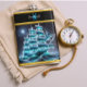 Um navio pirata espantoso com velas ondulantes deslizam sem esforço sobre ondas luminosas sob uma lua brilhante de cheio. As águas brilham com matizes azuis encantadores, criando uma atmosfera mágica que destaca a grandeza do navio e a tranquilidade ao redor.