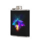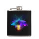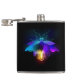 Voz mecânica, antiga, com lâmpada e asas finas brilha cor de laranja, roxo, turquesa sobre fundo preto. Estilo Steampunk.