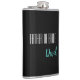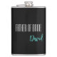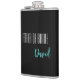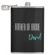 Frasco para o pai da noiva é mostrado em preto com texto azul turquesa e branco e tem um nome de exemplo.