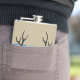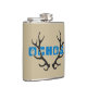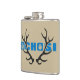 Bela garrafa para bebidas fortes enquanto está fora. Ochosi, o bowhunter. Nome em texto azul com design, combinado com chifres pretos.