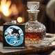 Uma orca pulando do oceano com água por toda parte. Montanhas e céu azul ao redor da baleia assassina desenhadas num estilo de tatuagem art nouveau.