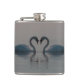 Foto incrível de dois cisnes nadando cabeça a cabeça criando a ilusão de um coração na água. Eles estão juntos num lago neblina de manhã cedo,