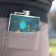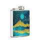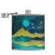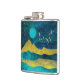 design de paisagem da montanha abstrato em tons de ouro, ciano e azul em tons negros, com um nascer, estrelas e pássaros.