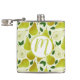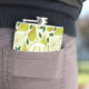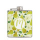 Um padrão de peras verdes vibrantes em tons de amarelo e verde com folhas verdes brilhantes. Algumas das peras são divididas pela metade para mostrar as dentro e sementes suculentas.