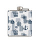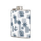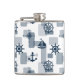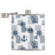 Design marítimo sem costura, com embarcação à vela, bússola, âncora e decoração das rodas de vela em fundo geométrico azul e branco