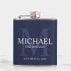 Adicione um toque pessoal ao seu casamento com um frasco de padrinhos de casamento personalizado. Este frasco apresenta um nome de padrinho de casamento personalizado com título e data de casamento em branco e monograma em azul-marinho claro como fundo, em estilo serif clássico, em fundo azul-marinho. Também perfeito para o melhor homem, pai da noiva, porta-voz e muito mais.