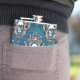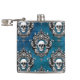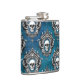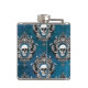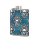 Uma imagem do crânio é enquadrada por um design de estilo gótico ornamentado e colocada num padrão que cobrir a superfície deste frasco único. O padrão é colocado sobre um fundo azul real gradiente.