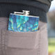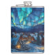 Panoramic stained glass winter village, glowing house windows, snow-covered rooftops, twilight blue sky with auroras, 3:1 ratio, warm Christmas feel, detailed yet soft glass texture
