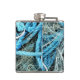 Um design colorido de uma rede de pesca e uma corda azul brilhante de um barco e armazenada no cais do porto.