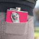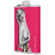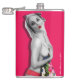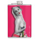 Nostalgic Pinup Girl Hip Flask, com trabalho de arte de pinup original ©"Miss Cherrie Au Lait - Bath". Fundo rosa com imagem maior do alternativo.