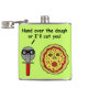 Este bobo de trocadilho humorístico mostra uma fatia de pizza dizendo a uma pizza de desenho animado, "Passe a massa ou eu corto você!" O cortador de pizza veste uma máscara preta como um assaltante e a pizza é fazer rosto assustado na forma de boca redonda de pepperoni, olhos de azeitona e nariz de cogumelo.