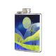 Uma paisagem de abstrato que representa colinas rolantes com primavera e plantas florescentes e uma lua e estrelas em tons de azul, ciano, amarelo e rosa.