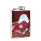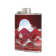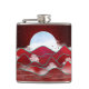 design de paisagem abstrato em vários tons de vermelho com um luar, colinas, árvores, nuvens e aves.