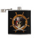 Aargh! Pirateie o crânio, o remendo do olho, o chapéu do pirata, e espadas cruzadas sobre a roda de um navio de madeira antigo.
