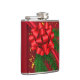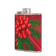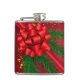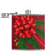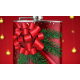 Balão festivo adornado com fundo vermelho vibrante, com um grande arco vermelho brilhante no seu centro. Ao redor do arco, lavam ramificações verdes de pinheiros, adicionando um toque da natureza ao design. O confete de ouro espalhado melhora o fundo.