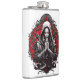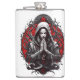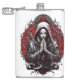 Minha arte retrata uma figura que combina elementos do misticismo e da arte gótica, apresentando um personagem central com uma expressão serena, mas intensa. A mulher vestida de roupão encapuzado. A pele dela é pálida, quase branca, dando-lhe uma aparência etérea. Ela tem as mãos amarradas em um gesto de oração, enfatizando um sentido de contemplação ou ritual. O rosto da mulher está muito estilizado, com uma base branca e marcas vermelhas. Um pequeno ponto vermelho está presente na testa, e linhas vermelhas adicionais estão abaixo de seus olhos, o que aumenta a aura mística.