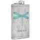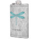 Aproveite as suas bebidas alcoólicas favoritas a qualquer momento com um frasco de Dragonfly Teal Damask Vinyl Wrapped. O design de fenda apresenta uma libélula colorida contra uma cor damasco de cinza elegante. Itens de presentes adicionais disponíveis com este design também.