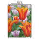 Tulipas laranja Brilhantes no parque num dia ensolarado no jardim. A foto foi tirada em junho de 2022. O poster é adequado para o design do interior.