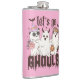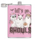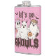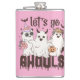 Design de Halloween bonito e espirituoso em T-shirts, canecas, bolsas, travesseiros, botões, e mais, apresenta três fantasmas de Dia de as Bruxas engraçado com buzinas diabólicas e chapéus de bruxa, morcegos, flores, abóbora de jack ou lanterna, e texto que lê Vamos Ir Ghouls!