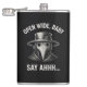 Trabalho de arte de alto contraste, preto, com uma ilustração detalhada da praga do estilo vintage. A design combina linhagem intrincada de preto e branco com texto lúdico e sugestivo: "ABEN WIDE, BABY" acima e "SAY AHH..." abaixo. Perfeitamente equilibrado entre macabro e viscoso, esse gráfico combina a história gótica com humor escuro para um visual impressionante e inesquecível.
