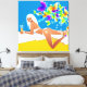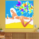 Menina branca exótica, deitada na praia com sua bebida tropical, borboletas voando sobre ela. - contemporâneo em estilo e diversão de admirar - Perfeito para escritório, casa ou lobby. Pode ser facilmente dimensionado para baixo -