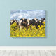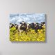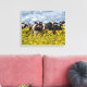 Esta canvas apresenta uma fileira de vacas negras e brancas que ficam atrás de uma cerca de arame farpado com ervas amarelas brilhantes no primeiro plano e um turbulento céu de cinza azul atrás. Seria um perfeito pop de cor onde quer que você o mostrasse.