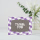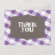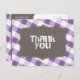 O país do sul inspirou o obrigado rústico que vocês postais desenharam com "Obrigado" em branco sobre uma ilustração de textura de canvas marrom, em um padrão de gingham branco e roxo diagonal. O verso é personalizado com a sua própria mensagem personalizada de obrigados. Você também pode facilmente excluir o texto modelo para deixar o(s) vazio(s) da(s) placa(s) para escrever manualmente seus próprios sentimentos de gratidão. Estas cartas, com o seu padrão clássico de gingham, são perfeitas para celebrações do Chá de fraldas e do Chá de panela Sul.