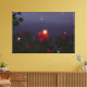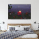 Ao anoitecer, os vagalumes flutuam e brilham sobre um jardim de rosa cheio de rosas vermelhas vibrantes.