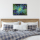 Folhas de vidro manchadas, de cor verde e turquesa, apresentam uma flor central em tons de azul e roxo.