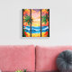 Arte de parede de canvas representando um cenário de praia tropical completo com ondas ondulantes, coqueiros e o sol de fixação. Pode ser usado em um escritório, hotel, espaço público ou casa.