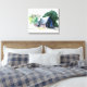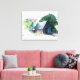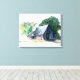 Aquarela de um celeiro vermelho rural entre as árvores verdes. A luz do sol destaca o telhado, sobre a porta aberta sombreada. Impressão de aquarela original feita por John A. Muir.