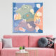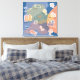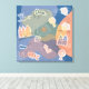 Canvas afbeelding van stad met huisjes, bomen, vogel en vis. Kleur blauw tinten