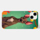 Adorável cão de desenho animado sentado feliz contra um pano de fundo festivo. O cão tem orelhas grandes e expressivas e uma expressão alegre, com casaco castanho claro e uma nítida mancha branca no peito. No fundo, há uma cena de feriado alegre com decorações verdes e vermelhas