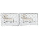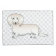 A ilustração original de um desenho animado de um cão da raça Dachshund, de cor casaco de creme de cabelo comprido. O fundo tem um padrão de pegadas de cinza.