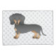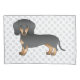 A ilustração original do desenho de Destei de um lindo cão da raça Dachshund, preto e casaco bronzeado, de cabelo curto. O fundo tem um padrão de pegadas de cinza.