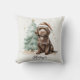 É uma almofada com um cachorro fofo e um padrão de árvore de Natal.