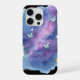 Uma capa de celular galáctica sonhadora com tons de espaço em aquarela suave e borboletas brilhantes.