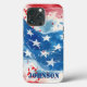 Proteja seu iPhone com estilo com nossa capa de iPhone temática patriota. Mostre seu orgulho americano com o design vermelho, branco e azul enquanto mantém seu telefone seguro contra arranhões e batidas. Celebre o Quatro de Julho todos os dias com esta capa elegante e durável que grita patriotismo! Personalizado com nome.
