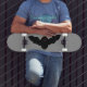 Este skate incrível apresenta um morcego vampiro assustador com olhos mau vermelhos e presas brancas agudas. Esta design divertida é perfeita para o Dia das Bruxas e deveria divertir as crianças e os adultos.