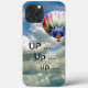 Balão de ar com padrão de arco-íris subindo para as nuvens brancas e fofas em um céu azul. O texto diz "SUBINDO ... Subindo ... subindo ..."