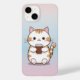 Um plano de fundo pastel simples com um gato adorável segurando uma xícara de café em estilo vetorial limpo. Perfeito para impressão de capa de telefone, sem montagem.