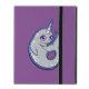 Uma cinza de luz giro, uma baleia narbaleia com manchas brancas e presas de chifre, grandes olhos roxos bonito, e um sorriso feliz com sua cauda enrolada sobre uma cor de fundo roxa leve. Desenho de tinta original com linhas gráficas limpas de Alicia Marie.
