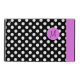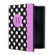 Estojo do estilo de folio do Na moda iPad com suporte integrado feito em uma bolinhas preta e branca. Uma banda rosa brilhante, correndo pela borda direita e um disco rosa brilhante, na frente do meio, tem um monograma preto de uma letra pronto para personalizar. Faz uma ideia personalizada de presente de excelente.