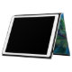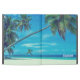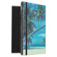 Um caso personalizado no ipad com uma foto temática tropical apresentando palmas de coco que se estendem através de uma praia branca arenosa isolada. Águas turquesas e um céu azul azul de azure no fundo.