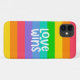 Este trabalho de arte apresenta um arco-íris colorido com as palavras Love Wins.