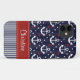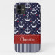 Este teste padrão feito sob encomenda da âncora dos azuis marinhos e do branco com listras, corações e um teste padrão de bolinhas pode ser personalizado com seu nome no vermelho IMPRESSO e no design costurado branco do olhar da fita. Accessorize seu dispositivo favorito com este design inspirado náutico formal e à moda. Isto faz um presente bonito para menina das mulheres, da esposa de um capitão, a adolescente ou toda á feminino. © Chrissy H. Estúdio dos trabalhos de arte, LLC. Todos os direitos reservados.