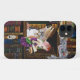 Dois gatinhos e uma fada sentam-se sobre uma estante de livros cheio para seu gato mágico.