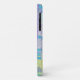 Essa capa de telefone lança uma colagem digital composta por várias camadas de varreduras de fotografias, pinturas e texturas. Um aglomerado de flores violetas azuis senta sobre um fundo abstrato em tons de lavanda, verde, roxo e tons de azul.